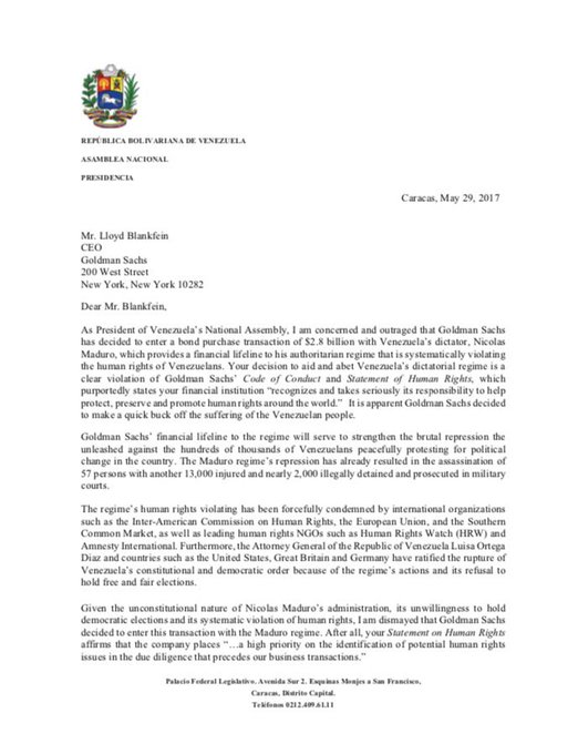 En abril de este año, el diputado opositor envió una docena de cartas a importantes bancos globales para exigirles no hacer ninguna operación con Venezuela. Hoy hizo lo mismo con Goldman Sachs y agregó una amenaza: "Tengo la intención de recomendar a cualquier futuro gobierno democrático en Venezuela a no reconocer, ni pagar estos bonos", refierePanorama.